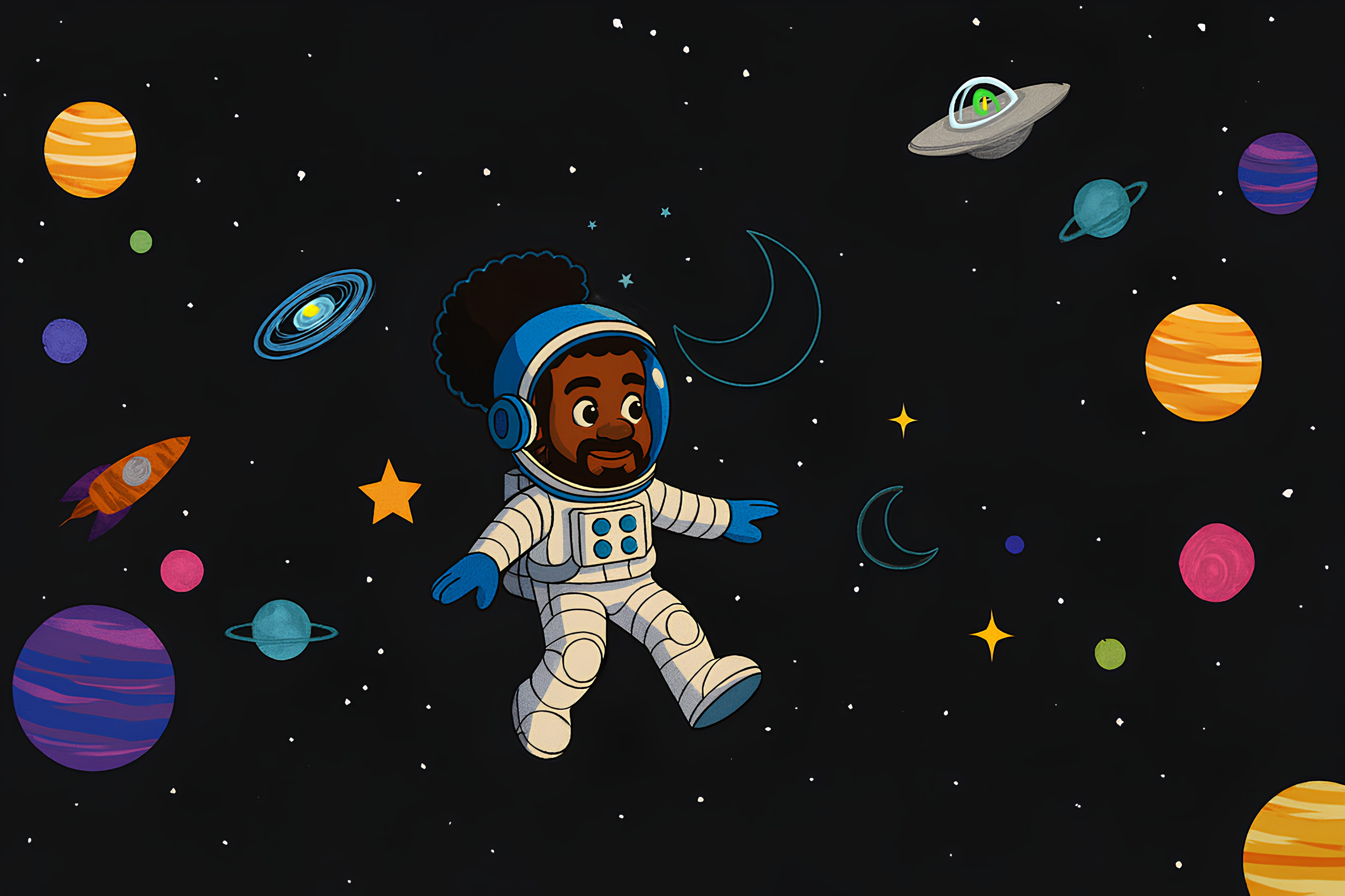 Buluku is a curious afronaut who travels through space-time to share adventures about the creation of the Universe, transforming ancient African knowledge into contemporary experiences. Alongside his inseparable androids, Kandjila and Zuri, he visits unknown planets and celebrates the power of imagination, diversity and coexistence between worlds.